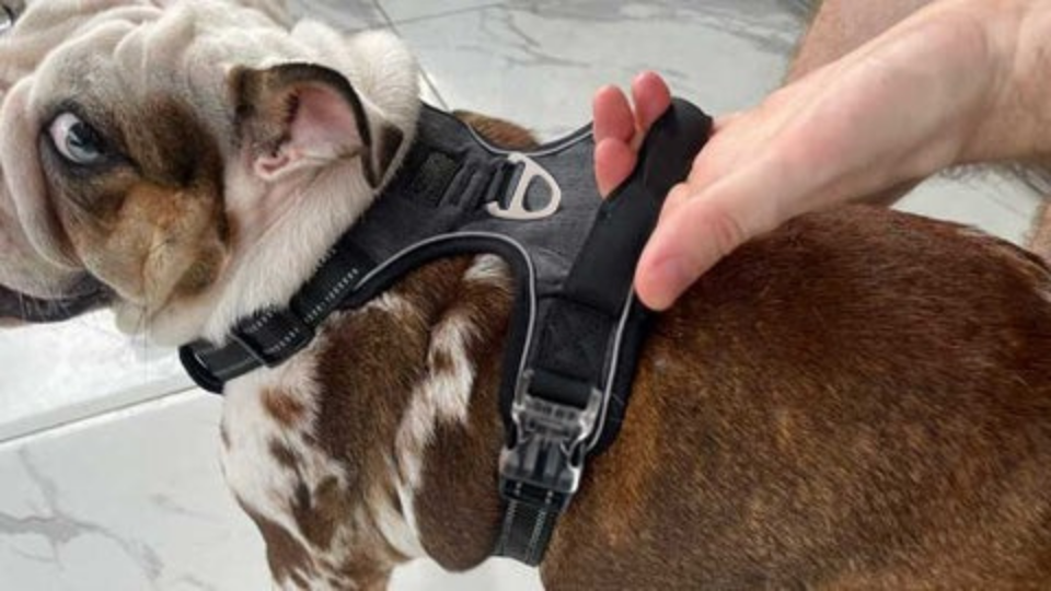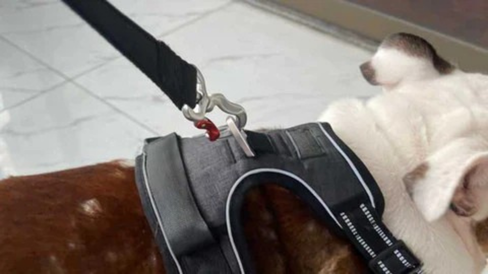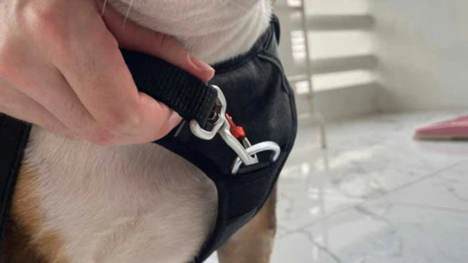 Przymocuj smycz do specjalnego zaczepu No-Pull na szelkach.